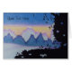 The original art illustration on this great art card is produced from a watercolour picture that I painted a few years ago. I really enjoy working with this illustrative image. I used colouredpencils for this mountain sunset landscape painting, I think the colours look great framed by the solid black silhouette of the trees in the foreground, the picture has little bit of a fairy tale effect. With its sunset sky this brightly coloured landscape art looks very original on this greeting card. This is a customisable card, you can personalise it with your own text.