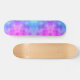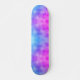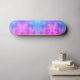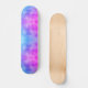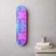 The skateboard has an abstract blue and purple pattern. The design may remind you of tie-dye.