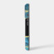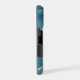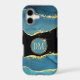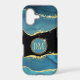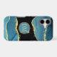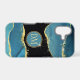 This elegant phone case features your two letter monogram in pale gold at the centre of a blue circle banner that is double framed in gold. The banner is placed on an abstract background in tones of blue alcohol ink, black border, and gold embellishment.
