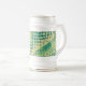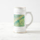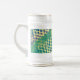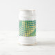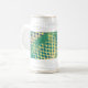 Painting of abstract diamond shapes of blue, green, and purple, on a yellow background is printed on steins.