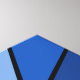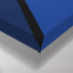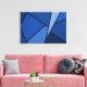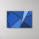 Inspired by stained glass, this stylish geometric design contains polygons in various shades of blue outlined in black. A light blue triangle slashes in from the upper right with an array of progressively darker blue quadrangles and other shapes spiralling around it from light to dark. Two dark blue shapes ground the left side of the original design.
