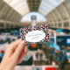 This name or identification badge has a bright abstract circular pattern of white circles with smaller red circles inside on a black background. Customise your name and information in the white oval with the templates.