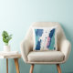 This image showcases a square, white throw pillow featuring an abstract design of bold brushstrokes in varying shades of blue, teal, and pink. The pillow is displayed against a light grey background, emphasizing the vibrant and modern pattern.