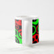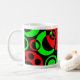 An exciting and fun abstract design made up of circular bubble like shapes in vibrant contrasting red and green with black.