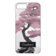 Beautiful pink cherry blossoms adorn this abstract cherry tree bonsai phone case. It also features a personalised name badge in black with white text at the bottom centre.