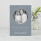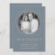 Share the news of your engagement in style with these elegant engagement announcements! The announcement features your engagement photo encircled by faux gold abstract circles on a dusty blue background. "We're Engaged!" is displayed in white modern lettering with your name and details below.