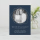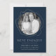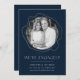 Share the news of your engagement in style with these elegant engagement announcements! The announcement features your engagement photo encircled by faux gold abstract circles on a navy background. "We're Engaged!" is displayed in white modern lettering with your name and details below.