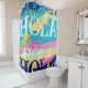 Hola text repeated in a colourful palette of blue, yellow, pink, turquoise and green.