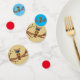 This table confetti has an abstract colourful owl with big blue eyes sitting on a tree branch with green leaves. Big circles have tan background, medium circles have blue background and small circles are plain bright red.