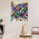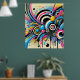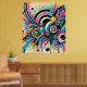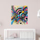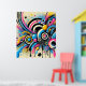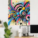 Vibrant and dynamic abstract design filled with circular shapes in various sizes and colours, including blue, pink, yellow, and black. The overlapping circles and wavy lines create a sense of motion and energy, enhanced by splashes of paint and dots, on a subtle beige background.
