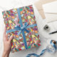 A confetti tapestry of colours form this abstract design. Background in silver purple glitter.