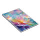 The image features a close-up of abstract floral forms in pastel colours. The petals blend shades of pink, blue, yellow, and purple, creating a soft, dreamlike quality. The centres of the flowers glow with a bright, golden light. Water droplets are scattered across the petals, adding a touch of realism. The background is blurred, enhancing the focus on the delicate floral details.