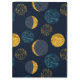 Fun abstract pattern of moon and stars on a dark blue background with printed gold foil accents.