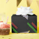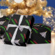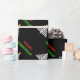 This wrapping paper design features an abstract representation of a decorated Christmas tree with a star on top, along with a black background. It also features the greeting, "MERRY CHRISTMAS!" in red and green.