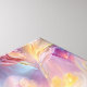 The image presents an abstract floral composition with a dreamlike quality. Large, stylised flowers in shades of purple, yellow, and pink dominate the foreground, their petals appearing translucent and glowing. The background is a swirling mix of blues, greens, and purples, creating a soft, ethereal atmosphere. Smaller floral elements with delicate stems reach upwards, adding depth to the scene.