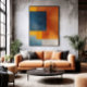 Abstract composition dialoguing between organic and geometric. Layers of oceanic blue, solar terracotta and amber meet on textured surfaces, evoking aerial landscapes. A work that transforms spaces with contemplative sophistication and earthly energy. Ideal for environments seeking balance between modernity and human warmth.
