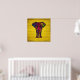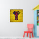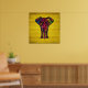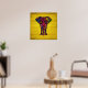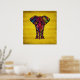 A poster with an abstract elephant design with a rainbow selection of bright vivid colours with decorative designs inside such as mandalas and geometric leaves and flowers. Set on a vintage style background in warm yellow with faded stripes.