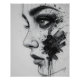 A left-facing close-up of a woman's eye and cheekbone, rendered with heavy abstraction through blotchy ink patches and spontaneous brushwork. Only a portion of her face is visible, gradually fading into white, creating a striking and enigmatic composition that emphasizes mood and mystery through bold, expressive strokes.