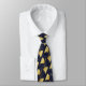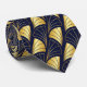 This is a beautiful neck tie that is appropriate for any formal or informal occasion. It features an interesting vector pattern using gold line art in a fan shape, with half of the shapes being solid gradient gold, and half being line art. The pattern is placed diagonally on a navy blue background. Both the front and the back of the tie have the same pattern.