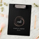 Chic clipboard features your initial(s) or monogram in calligraphy script inside a faux rose gold foil abstract circle element on a rich black background. Personalise with two lines of custom text beneath. Design repeats on reverse side.