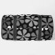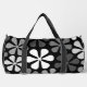 A fun and funky retro style abstract flower surface pattern design in white and greys on a black background.