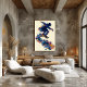 This abstract fluid ink artwork portrays a skater in mid-jump, formed by flowing layers of blue, gold, and violet. The composition expresses speed, balance, and rhythm while maintaining a clean, contemporary aesthetic. Ideal as modern wall art for interiors, studios, and creative environments.