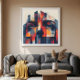 Intense eyes emerge from geometric shapes in red, orange, and blue. Abstract digital art with splatter texture and vertical lines. Contemporary design perfect for modern decor, posters, or creative projects. Artistic expression that conveys emotion and sophistication.