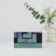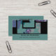 Cool artistic design with all kinds of different colours and sizes of squares floating around. A black square maze, celtic style knot creates an interesting border design in this piece. The colours in this design are muted and subtle in varying shades of purple and green. Modern business card design.