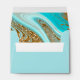 This design set, with it's abstract pattern of flowing ripples and veins of glittering gold, brings to mind eye-catching rock formations, flowing sand dunes, and gentle ocean waves. The striking colours of sea and sand for this set adds to the appeal. The coordinating envelope shown here has all the above with an abstract interior and optional dark, robin's-egg-blue exterior. Easily add your initials and address using the provided template. Search ID903 to see other colour choices and coordinating pieces for this unique wedding collection.