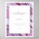 This wedding design set, with it's abstract pattern of flowing ripples and veins of glittering plum, brings to mind eye-catching rock formations and sparkling gems. The striking colour palette in shades from lilac and lavender to soft periwinkle adds to the appeal. The 'Welcome' poster shown here has the above bordering a white background with a template to easily add a welcome message, your names and wedding date. Search ID903 to see other colour choices and coordinating pieces for this unique wedding collection.