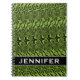 This notebook design features an abstract pattern with liquid-like splotch or blob shapes, coloured various shades of light and dark green. It also features a customised name.
