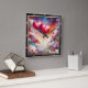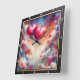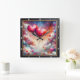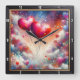 This stunning square wall clock features a breathtaking digital illustration of two large, vibrant pink and red hearts floating like hot air balloons. The hearts are tethered with delicate, swirling lines and set against a magical, ethereal sky filled with fluffy white clouds and a colorful nebula of blue, orange, and purple. Smaller hearts in various pastel shades drift through the air, accompanied by shimmering stardust and whimsical light effects. The artwork is housed within a modern black wood-grain frame with bold white numeric markers for easy timekeeping. This functional home accessory is an ideal decorative piece for bedrooms, living rooms, or as a sophisticated Valentine Day gift. Its dreamlike atmosphere and rich, multi-colored palette provide a serene and romantic focal point for any interior wall.