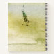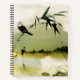 Delicate Japanese watercolor abstract landscape in soothing muted greens, shows a crane and his reflection in the background and a bird on a tree branch in the foreground.