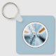 This round keychain features a light blue fractal art in a round frame.