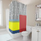 This shower curtain has a design of broken black lines running vertically into rectangles of light blue, green, blue, yellow, and red. Want different colours? Message me.