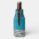 This bottle cooler has a geometric design of a large teal rectangle in the upper left corner, darker teal stripes in the upper right corner, a lighter smaller teal rectangle below the stripes, and black lines across the bottom. If you like the design but prefer different colours, message me.