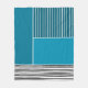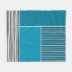 This medium fleece blankets has a geometric design of a large teal rectangle in the upper left corner, darker teal stripes in the upper right corner, a lighter smaller teal rectangle below the stripes, and black lines across the bottom. If you like the design but prefer different colours, message me.