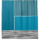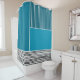 This shower curtain has a geometric design of a large teal rectangle in the upper left corner, darker teal stripes in the upper right corner, a lighter smaller teal rectangle below the stripes, and black lines across the bottom. If you like the design but prefer different colours, message me.
