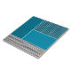 This tile has a geometric design of a large teal rectangle in the upper left corner, darker teal stripes in the upper right corner, a lighter smaller teal rectangle below the stripes, and black lines across the bottom. If you like the design but prefer different colours, message me.
