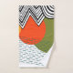This towel set has a mid-century modern design of curvy and zigzag lines in black, circles in yellow, orange, and green, and a rectangle made from dashed teal lines. If you want the same design with different colours, message me.