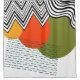 This shower curtain has a mid-century modern design of curvy and zigzag lines in black, circles in yellow, orange, and green, and a rectangle made from dashed teal lines. If you want the same design with different colours, message me.