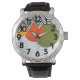 This men's watch has a mid-century modern design of curvy and zigzag lines in black, circles in yellow, orange, and green, and a rectangle made from dashed teal lines. If you want the same design with different colours, message me.