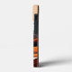 A minimalist, abstract landscape in shades of red-orange, brown, and tan with hills, a river, and an enormous setting sun creates a beautiful phone case.