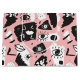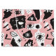This design features an abstract pattern constructed of hand drawn eyes and lips on a pink background.