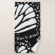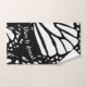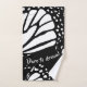 Abstract Monarch butterfly wing with motivational text - Dare to dream! - decorates the bath towel set in black, and white. Customise it by modifying the colour of the towels. Your colour will replace the larger white wing areas and pair with black and smaller irregular white dots framing the wing. Additionally, personalise the text. Like this, it is easy to accommodate your bathroom decor colour or create a personalised new home gift for your cousin. For custom designs or help with the customisation, contact https://t.me/KBMD3signs_chat.