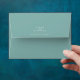 A paint strokes watercolor, in sparkling shades of sea glass green with splashes of soft blush pink, accents most pieces of this beautiful wedding suite. The coordinating envelope shown here features a glitter interior and solid sage green exterior with a template to easily add your own names and address on the back flap. Search ID886 to see other pieces and colour choices for this set.