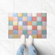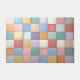 This abstract image is a visually striking pattern of a wall of square tiles. The squares are arranged in a regular grid and feature a soft, calming pastel color palette that includes shades of pink, orange, and green. The subtle 3D effect of the tiles and their textured, matte finish create a clean and modern background design.