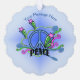 This hanging ornament card has a blue peace sign with the text Peace in an abstract design of pink blue, and green scrolls and stars on a blue background. Customise your text with the templates on the front and back.