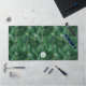 Bold peacock feather images in tones of blue green, gold, and royal blue are overlaid and grouped together to form an interesting pattern on this desk mat. Your monogram is at the centre bottom within a white circle banner double lined in matching green and teal blue.