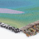 A quality printed throw has its advantages. This is a much finer weave throw than its loopier cousins, and though lighter, it is worth the investment for custom room accessorizing. The back is much prettier than the typical brown, and the fringe on the long sides very vivid, the selvage nicely done. Before photographing, I washed the throw in cold water, delicate, with a thicker woven throw the same size. On tumble dry low, this throw was dry in half the time as the other. This is a very practical quality if you use throws for furniture covers or to wrap up in frequently. The sleekness of the fabric makes it a great layer for accenting or protecting without the feeling of sitting on too much stuff. Perfect for napping or when you feel a light chill coming on. The color printing is beautiful and on this fabric, matched the design and color of my Photoshop image. This is an advantage for blending room fabrics and colors. The fringe on the short sides prints the colors from the design image and therefore varies from the side fringe. I streaked a white fractal line through the plaid pattern to give the illusion of weaving. This printed as crisp as an illusory thread, and put some white in the short side fringe, showing another advantage of print vs loomed- for artistic purposes, line lines, detail, and color integrity can be planned and preserved. My loomed throws have color limitations and more of a needlepoint texture. Print throws reproduce an exact image. The throw felt a little stiff straight out of the package, but this went away in the first delicate wash. Of course I searched the wash water for ink or bleeding and there was none.